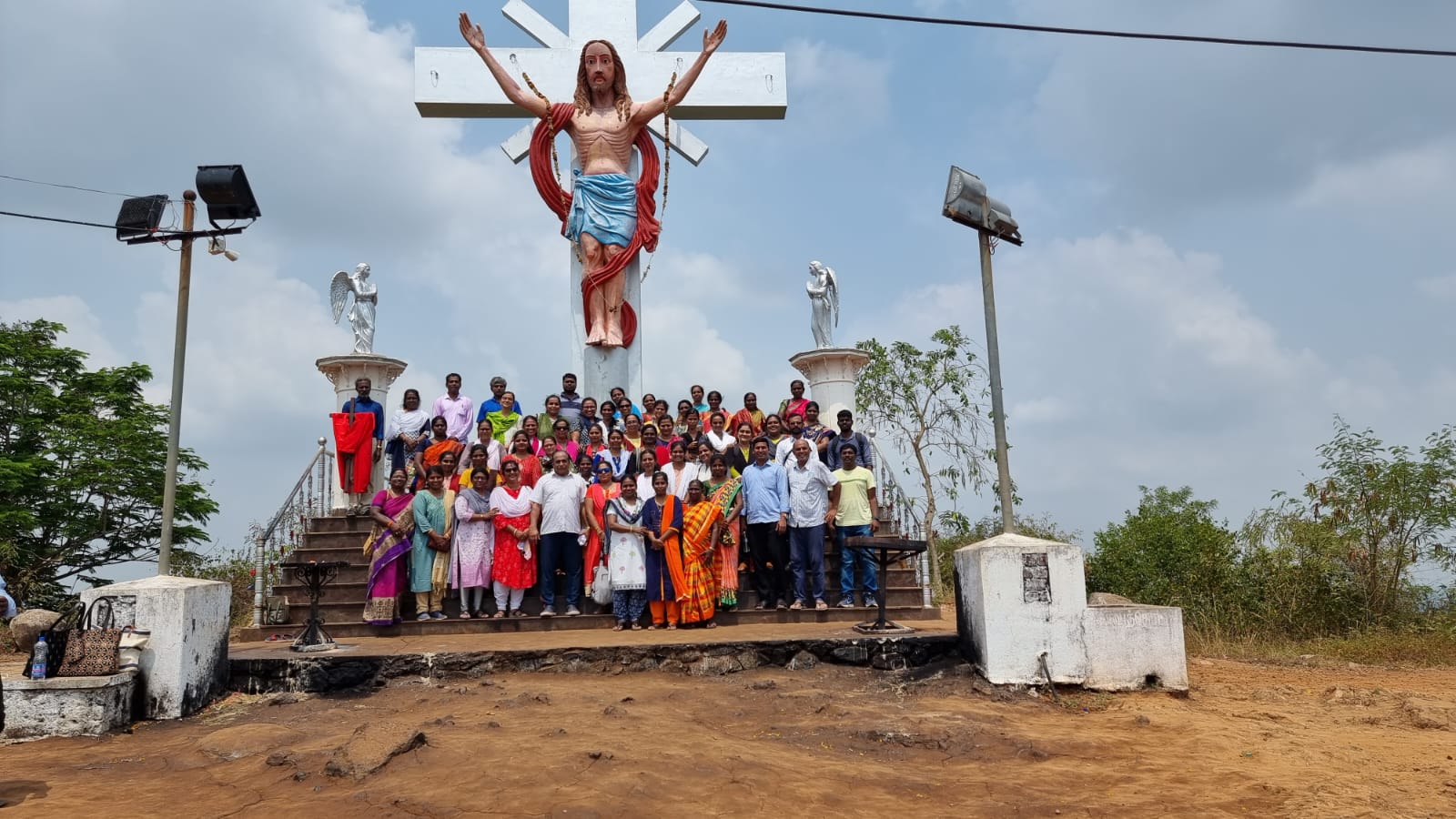 Nous avons commencé par une prière, puis nous sommes montés dans le bus à 8h00 pour un trajet de 85 km. Nous avons offert le chapelet, des litanies à la Vierge et des chants de dévotion tout au long du voyage. Nous sommes arrivés au sanctuaire Mazhai Malai Madha à 10h15 et nous nous sommes dirigés vers les marches de la colline pour notre chemin de croix.