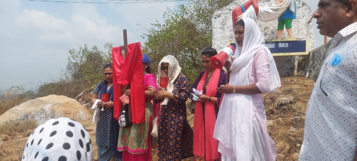 Le f. K K Thomas dirige la prière pendant le chemin de croix sur la colline du sanctuaire Mazhai Malai Madha